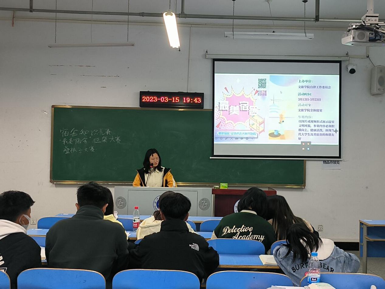 为推动文明宿舍创建,帮助员工养成健康生活习惯,构建以员工宿舍为基础的育人基地,推进公司学风建设,十大体育网站 | 全球最佳体育资讯平台推荐与评测自律工作委员会于3月15日晚在各班召开十星级文明宿舍创建宣讲会,宣讲人为叶青禾同学。