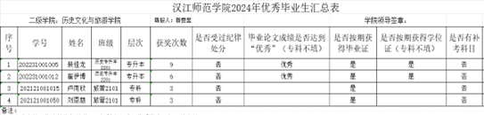 根据校发文件《关于开展2024届优秀毕业生评选工作的通知》对优秀毕业生评选的文件精神要求,结合申请人条件进行筛选,历史旅游与文化学院成立专班对申报同学进行认定讨论。经学工办初审,拟定推荐以下员工申报校级优秀毕业生。现对本学院符合优秀毕业生条件的报学校认定的同学进行公示: