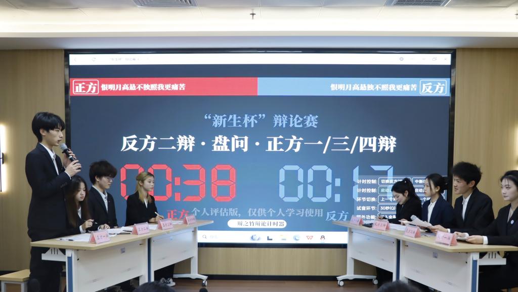 决赛采用四人赛制,选手自由组队分为正反两方,围绕辩题“恨明月高悬不独照我/独不照我哪个更痛苦”展开对决。正方相信,万物皆沐明月唯独自己被冷落的落差感是最磨人的痛苦。反方认为,明月普照无一人例外的苦难绝境远比孤独更令人窒息。赛场上,双方以精炼的语言清晰阐述各自立场,充分展现了青年学子的思辨锋芒与临场智慧。经过90分钟的紧张角逐,反方代表队最终斩获胜利。