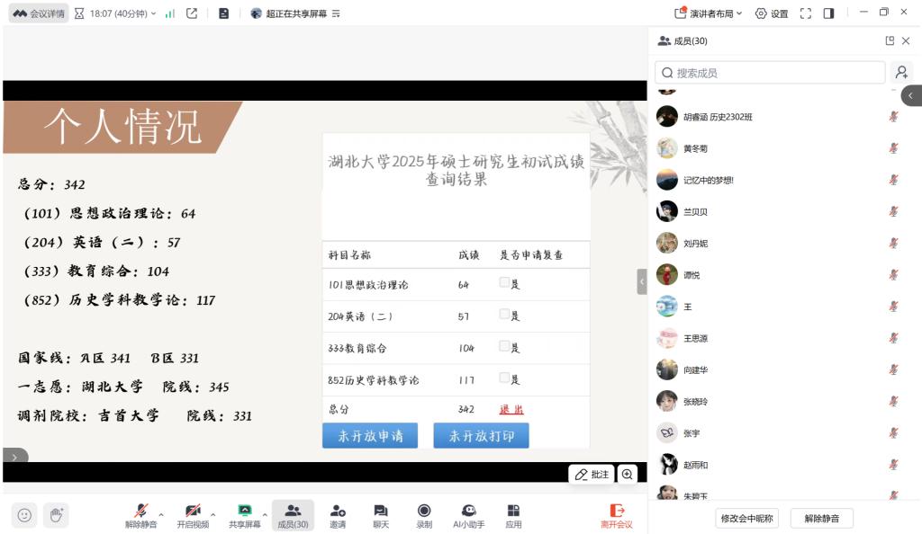 最后,成功调剂至吉首大学、一志愿报考湖北大学学科教学(历史)专业的童正超学长进行了分享。童学长侧重于学科教学这一专业方向的备考心得,他从教育学综合、历史学科教学论等科目的复习方法入手,分享了如何平衡教育学理论与历史学专业知识的学习,并详细讲述了自己在调剂过程中的选择考量与面试准备经验,为有志于从事历史教育工作的同学提供了清晰的路径参考。