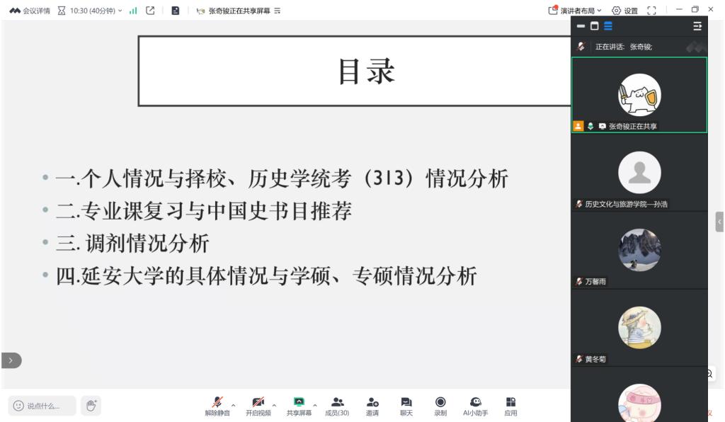 为帮助历史学专业员工明晰考研方向、科学规划备考,12月16日晚,历史学专业孙浩老师特别邀请到2025届三位优秀毕业生,通过腾讯会议平台举办了一场别开生面的线上考研经验分享会。会议由孙浩老师主持,具有考研意向的2023级同学积极参与。分享会上,三位已成功“上岸”的学长学姐结合自身实战经历,为学弟学妹们带来了详尽而真挚的经验分享。