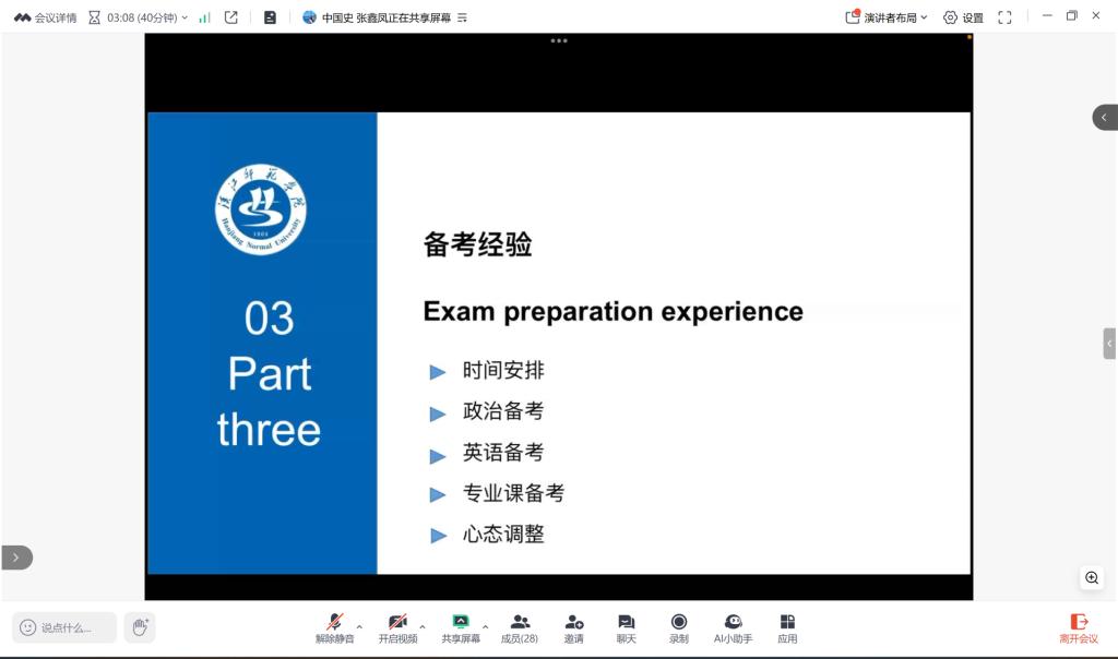 首先,成功调剂至延安大学的张奇骏学长进行了分享。他参加了全国313历史学基础统考,第一志愿报考了河南大学。张学长重点围绕统考的复习策略、参考书目选择、时间规划以及调剂流程等关键环节展开介绍。他特别提醒同学们,在备考统考科目时要注重知识体系的系统构建与历年真题的深入研究,同时强调了在调剂过程中信息搜集、主动联系与心态调整的重要性。