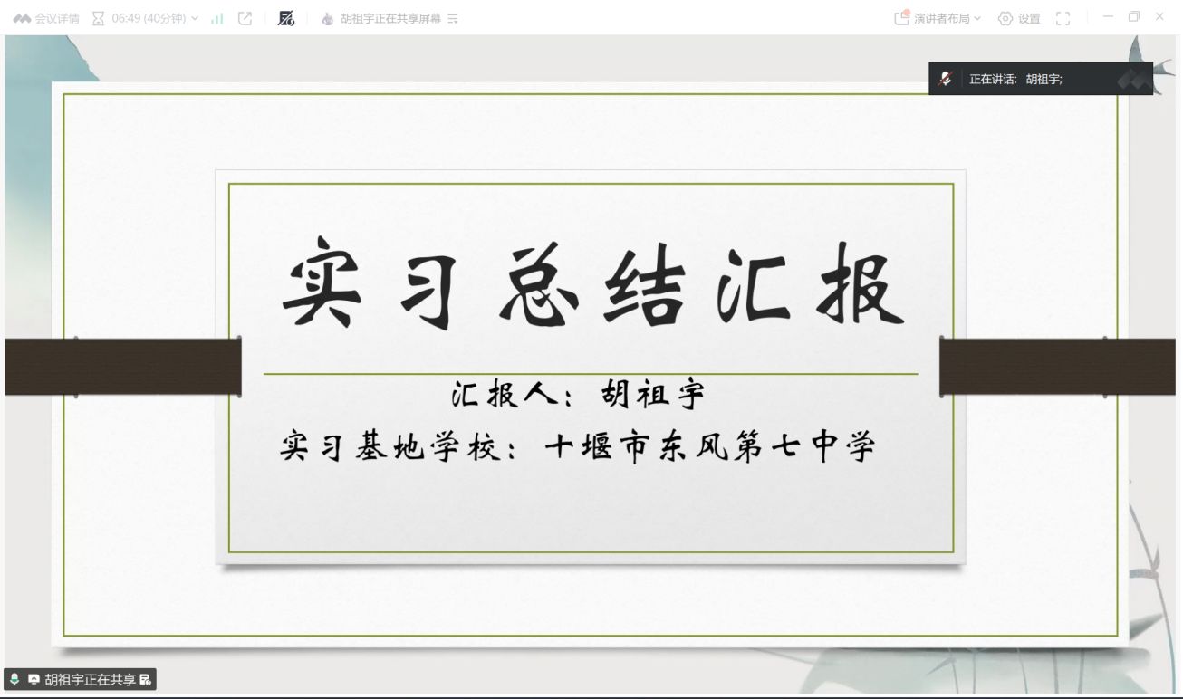 来自历史学2201班的胡祖宇同学以“多元参与+反思成长”为主题,分享了他在十堰市东风第七中学观摩优秀公开课、逐步参与片段教学到独立完成完整授课的进阶过程。他特别反思了一次关于“明治维新”的授课因对教材内容钻研不足而导致教学效果不佳的经历,深刻体会到“透彻把握教材是教学的根本基石”,实现了从“能够完成教学”到“努力追求教学成效”的认知跨越。