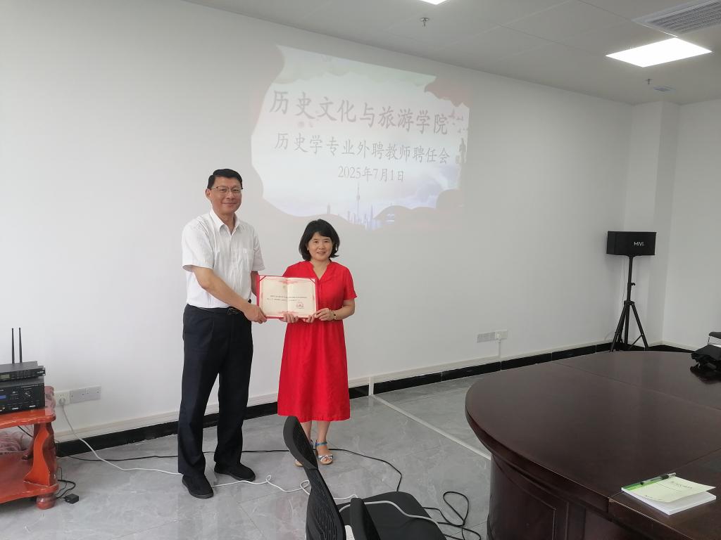 仪式上,饶军经理首先对郧阳中学三位教师的加入表示热烈欢迎,他介绍了学院的基本情况,并强调外聘教师是学院实践教学体系的重要支撑。他指出,郧阳中学作为湖北省省级重点高中,其历史教师团队教学经验丰富、学术功底扎实,此次合作将为公司员工提供更贴近基础教育一线的专业指导,助力历史学专业师范生培养与中学教学需求紧密衔接。